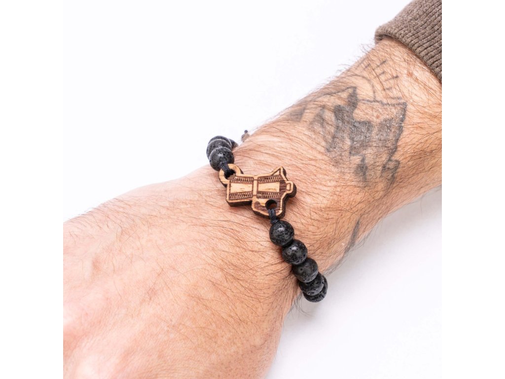 Každý náramek je ručně vyroben z kvalitního dřeva, bavlněného provázku a vulkanických kamenů. Dřevo je ošetřeno bezbarvým přírodním olejem.