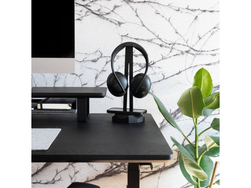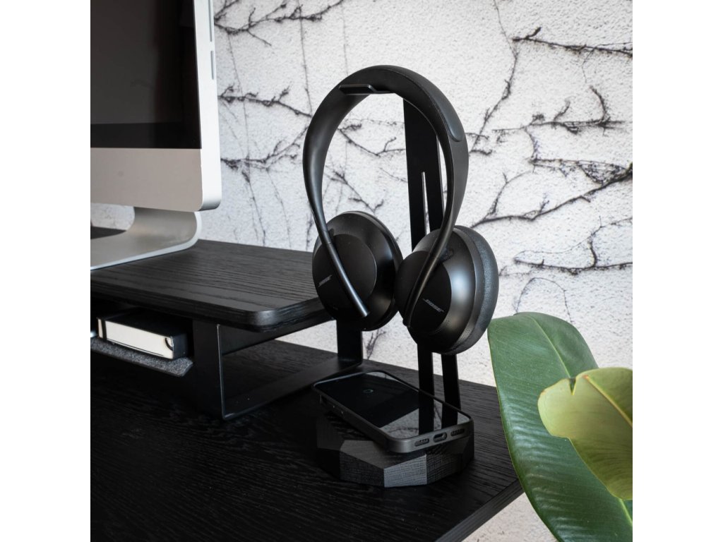 Luxusní stojan na sluchátka z dubového dřeva a černé oceli s bezdrátovým nabíjením QI bude skvělým doplňkem vašeho pracovního stolu.