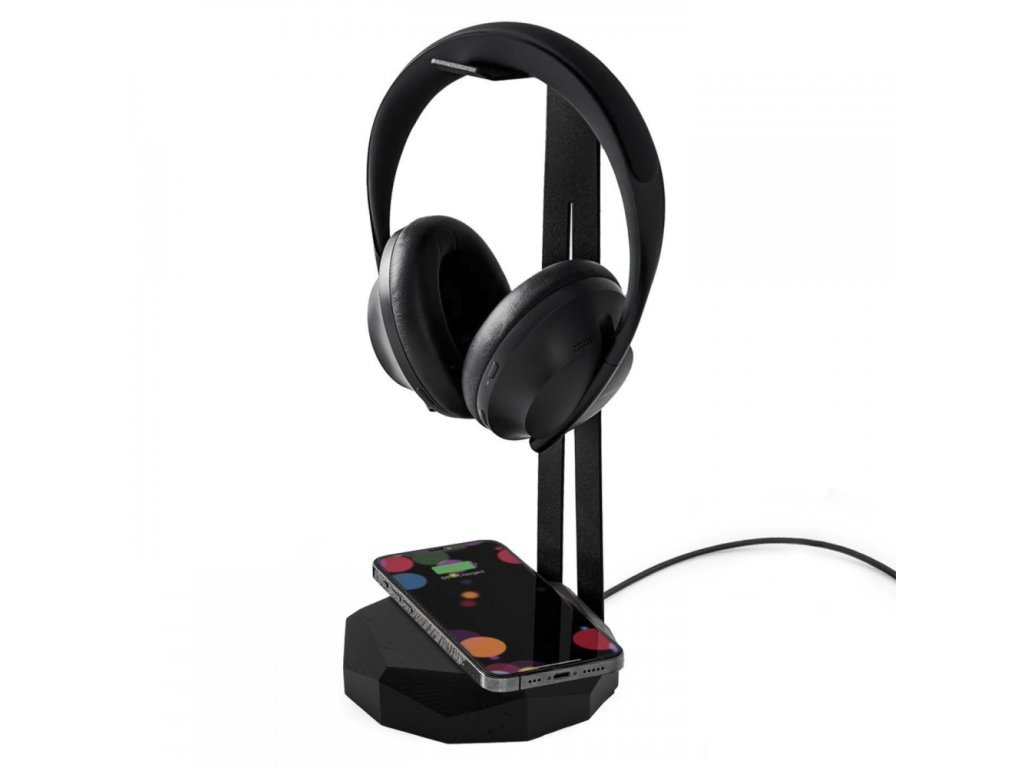Dřevěný stojan na sluchátka s nabíječkou QI 15W Dub - černá